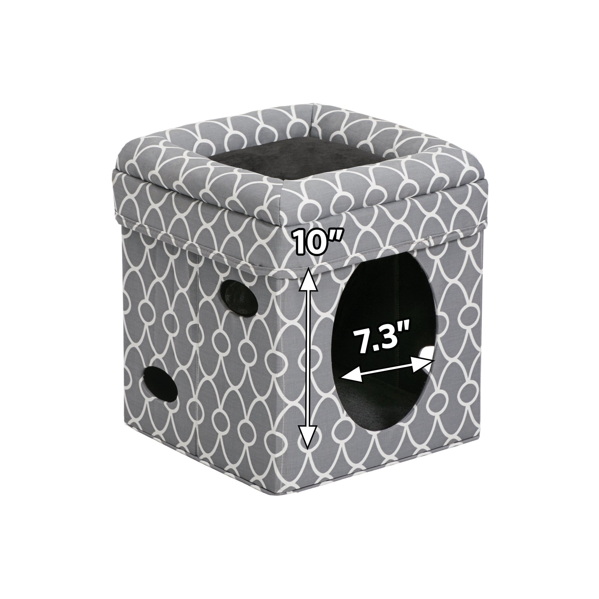 • Curious Cat Cube measures 15.5"W x 15.5"L x 16.5"H when assembled, features gray / geometric designer print fabric